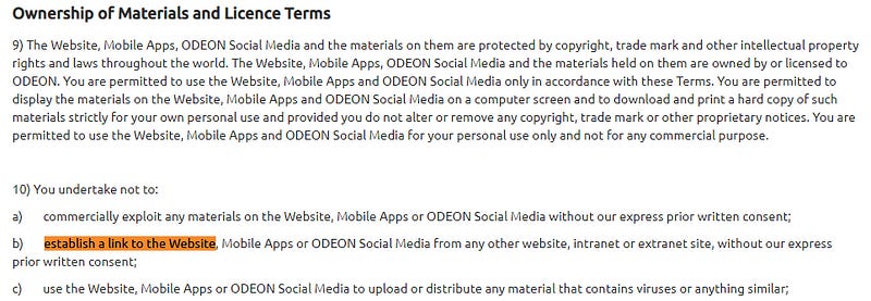 I couldn’t find a terms page on Ocado Group’s website, and the Spurs website terms appear to no longer worry about people linking to the site. What astonished me is that eight years on Odeon is still trying to stop you linking to its website. Whoops.